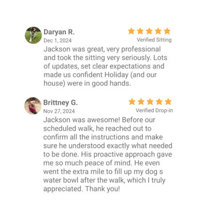Rest assured, your pet is safe with me. I’m a life-long animal lover and I’ve been a professional Pet Caregiver, dog walker and house sitter for the past 5+ years. I come with experience, dedication, passion and love. I'm also a long-time Austinite who knows the city and its neighborhoods and trails well. Take a look at what my clients Brittney, Daryan and Janna had to say about their experience!FREE meet-and-greet offered at start of service.Alright then... now it's time for me to meet your pet!