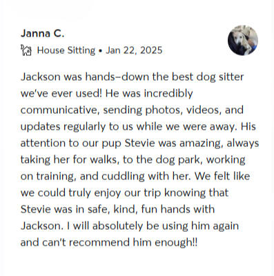 Rest assured, your pet is safe with me. I’m a life-long animal lover and I’ve been a professional Pet Caregiver, dog walker and house sitter for the past 5+ years. I come with experience, dedication, passion and love. I'm also a long-time Austinite who knows the city and its neighborhoods and trails well. Take a look at what my clients Brittney, Daryan and Janna had to say about their experience!FREE meet-and-greet offered at start of service.Alright then... now it's time for me to meet your pet!